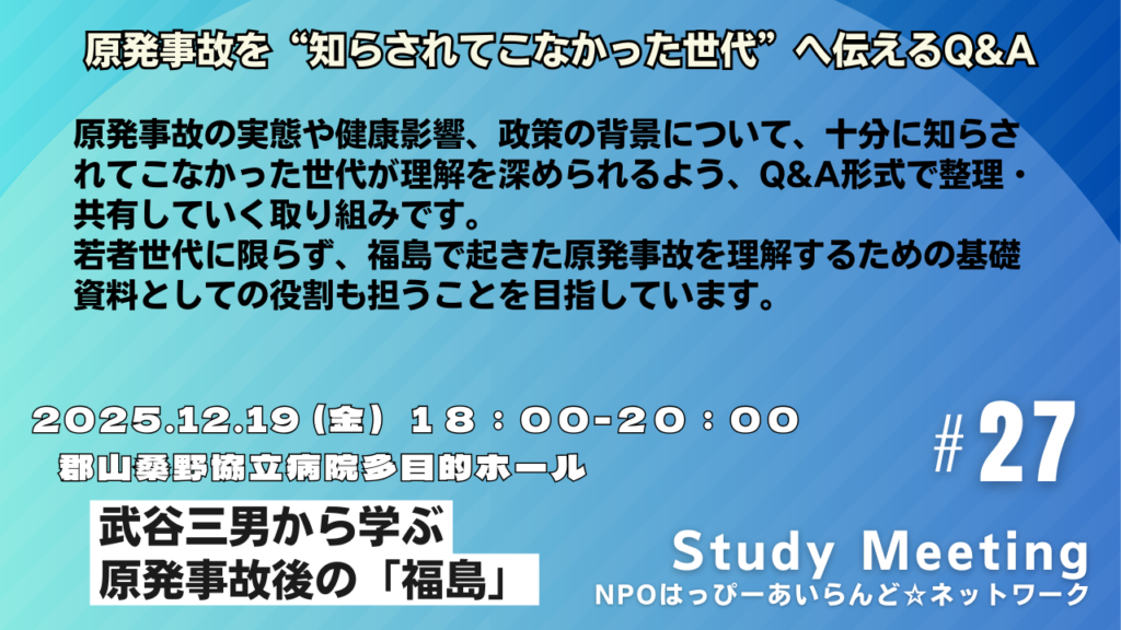 原発事故の実態や健康影響、政策の背景について、十分に知らされてこなかった世代が理解を深められるよう、Q&A形式で整理・共有していく取り組みです。