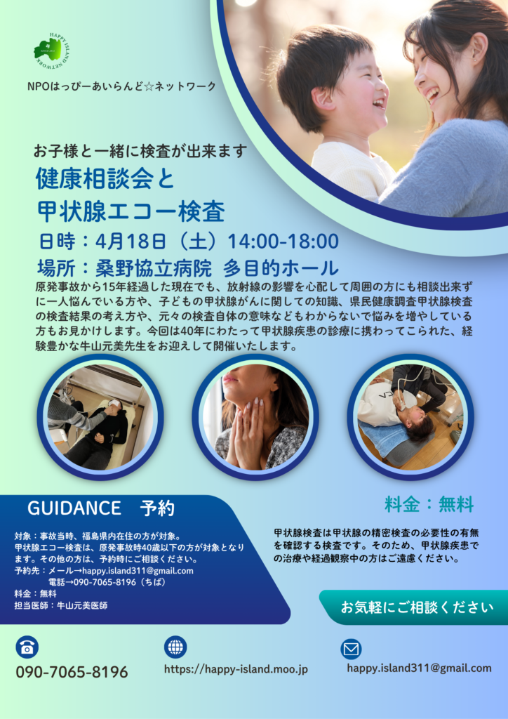 日時:4月18日(土)14:00-18:00場所:桑野協立病院 多目的ホール(病院の敷地にある別棟の建物になります。病院内では行っていませんので御注意ください。)〒963-8034 福島県郡山市島2丁目9-18対象:原発事故当時40歳以下で福島県内在住の方が対象となります。予約受付時間:14:00 14:30 15:00 15:30 16:00 16:30 17:00 17:30予約先:メール→happy.island311@gmail.com電話
